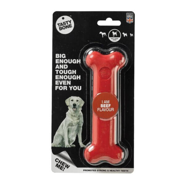 Le Tasty Bone est un jouet à mâcher pour chien au goût délicieux, qui se rapproche le plus possible de la réalité. Ce jouet pour chien est composé à 100 % de nylon solide et résistant. Unique jusqu’à la moelle, enrichi d’arômes irrésistibles, ton chien ne s’ennuiera jamais avec son goût durable. Ce jouet en os a été conçu pour éviter l’ennui et favoriser de bonnes habitudes de mastication. De plus, il contribue à la santé dentaire de ton chien. Cet os a un délicieux goût de bœuf et convient parfaitement aux chiens de petite, moyenne et grande taille. Le Tasty Bone est disponible en plusieurs saveurs délicieuses et en trois tailles. Chaque Tasty Bone peut être nettoyé à l’eau tiède.